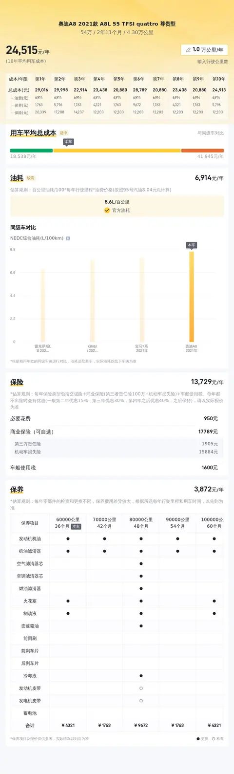 当前市场上,这款奥迪A8L的二手车行情大致在54万至64万左右。当然,具体的成交价格要根据车辆的车龄、里程、保养状况等因素综合评估。关于用车成本方面,根据估算,这辆车的年均综合用车成本在2.5万元左右。当然,具体费用还是要根据车辆的实际使用情况和车主的驾驶习惯而定。