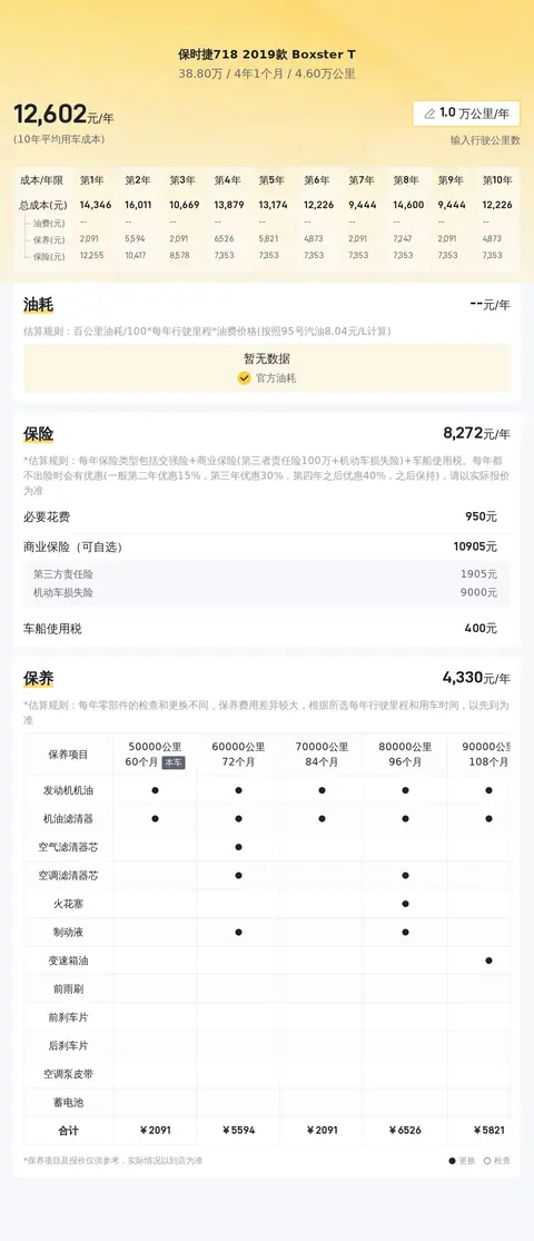 跑车买来之后注定是要开的,那肯定要考虑到用车成本。我们估算了一下,这辆车的10年平均用车成本大概是21,838元/年。