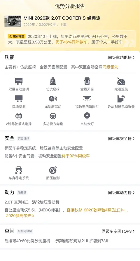 总结:在二手车市场中,每一辆车都有其独特的故事和状况。这辆二手MINI Cooper S经典派,以其合理的里程数、未曾过户的一手车状态、符合最新国六排放标准的优秀表现,以及全面检测后的良好车况,无疑凸显了其作为购车选择中的亮点。搭配先进的智能驾驶辅助系统,确保了驾驶时的安全与便利。在市场价位合理且极具竞争力的背景下,这款车不仅适合追求个性与品质的年轻专业人士,也推荐给所有热爱生活、享受驾驶乐趣的消费者。如果您正在寻找一辆集时尚、性能与实用于一体的二手车,那么这辆二手MINI Cooper S经典派无疑是您的理想之选。但请记住,二手车的实际情况和价格会根据多种因素而有所不同,建议您亲自查看车辆,确保它符合您的需求和期望。