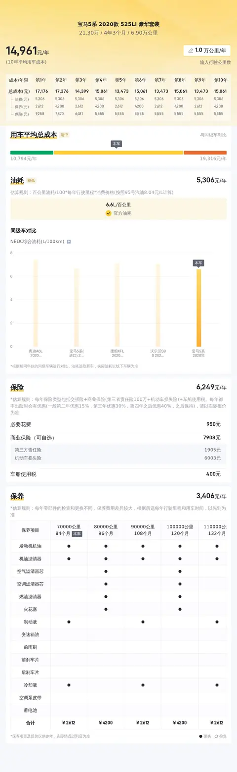 除了初始购车成本外,日后的使用成本也是不容忽视的一部分。经过估算,这辆宝马5系 2020款 525Li豪华套装的年均使用成本大约为1.4万元(按每年行驶1万公里计),但实际金额可能会随使用频率及维护情况而有所浮动。