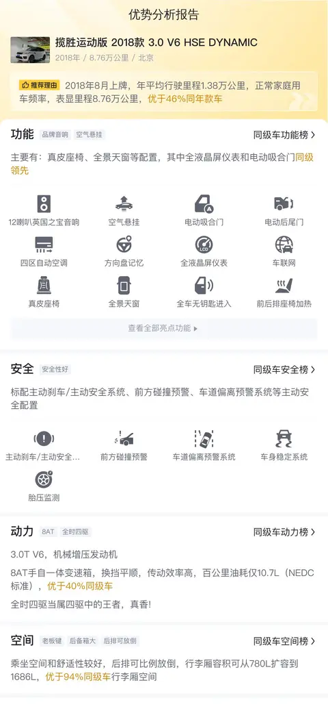 综上所述,这辆二手路虎揽胜运动版2018款3.0 V6 HSE DYNAMIC以其合理的市场报价、丰富的配置以及出色的乘坐空间和舒适性,在同级别豪华SUV中展现出了较强的竞争力。对于那些追求豪华品质又注重性价比的消费者来说,这款车无疑是一个值得考虑的选择。但同时也要考虑到路虎品牌较高的维护成本和复杂的机械结构等因素。建议消费者在购买前进行充分的了解和评估,以确保购买的车辆能够满足自己的需求并带来良好的使用体验。