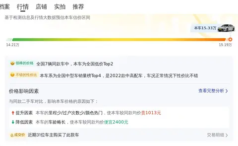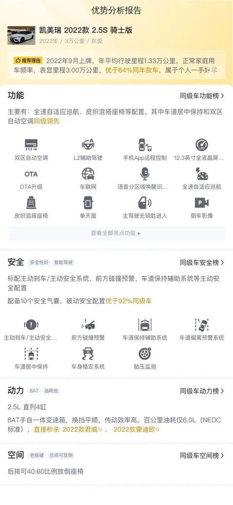 车况也是选择二手车时的重要考虑点。这辆凯美瑞 2022款 2.5S 骑士版上牌地为广东东莞,上牌日期2022年9月,表显里程3万公里,预计再行驶2年后可卖13万,约折价14.7%。这个幅度属于正常值,因为根据数据显示,凯美瑞的保值率还是比较高的。