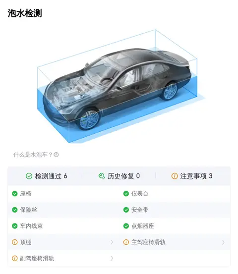 在车况部分,除了外观、内饰功能的检测,更多买家关注的是这辆车是否为“三非”车辆,三非就是指非重大事故、非火烧、非水泡。因为事故车、泡水车、火烧车都存在较大的安全隐患。不过您放心,这辆车已经通过了事故检测、火烧检测和泡水检测,可以确定它非重大事故车、非火烧车、非泡水车。