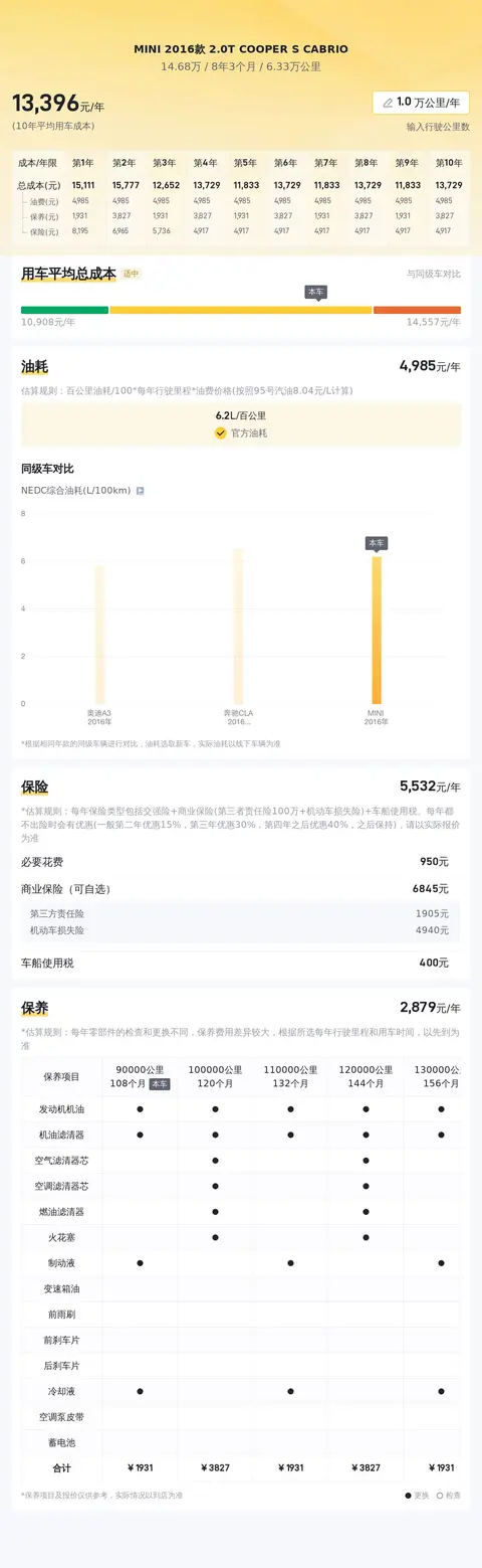 每年的平均用车成本是12640元,其实也符合正常水准,别看它小,吃的可是精粮。