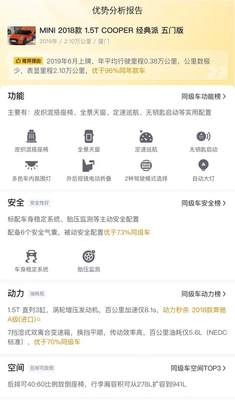这辆二手MINI 2018款1.5T COOPER经典派五门版整体车况良好,外观仅有轻微修复痕迹,内饰干净整洁,功能配置齐全且运行正常。动力方面表现优异,既能满足日常驾驶需求又能兼顾燃油经济性。车内空间虽不算宽敞但布局合理,足以应对一般出行需求。总体而言,这是一辆性价比较高、值得考虑的二手车。