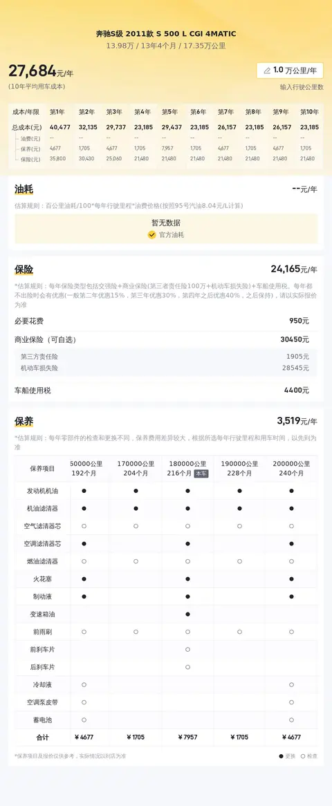另外,据估算,奔驰S级 2011款 S 500 L CGI 4MATIC 的用车成本是31501元/年,原价200多万的车,这个花费,也属于正常。