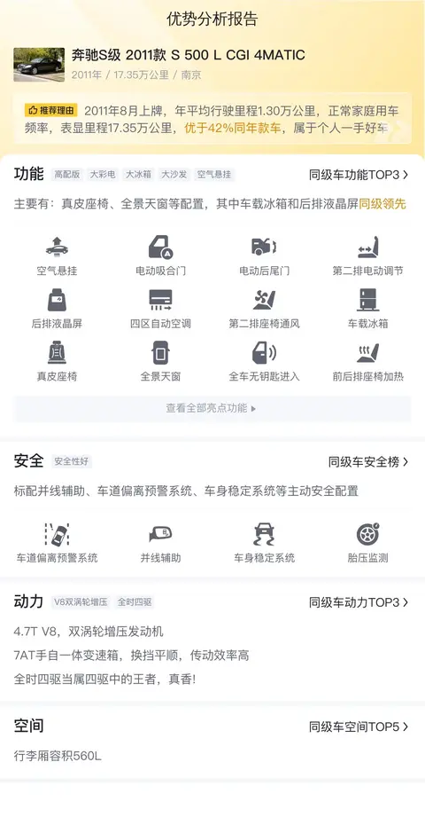 优势:曾经的明星同款,名气大,有面子。车龄13年多,里程值只有17.35万公里,平均一年也就1万公里出头,磨损程度并不高。配置丰富,真皮座椅、全景天窗、车载冰箱和后排液晶屏同级领先。安全配置上优于86%同级车。动力强悍,4.7T V8双涡轮增压发动机,同级领先。