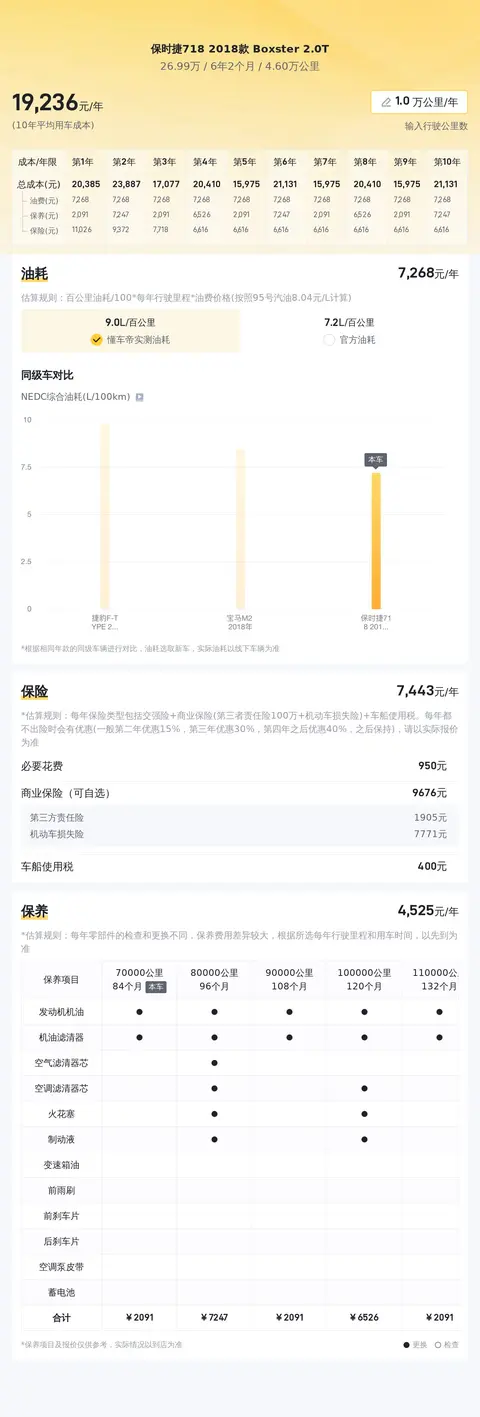 当前市场上,这款车型的二手车行情大致在34万至41万之间。当然,具体的售价会受到车辆状况等因素的影响。关于用车成本方面,根据估算,这辆保时捷718的年均综合用车成本约为1.9万元左右。这个数字可能会根据车辆的实际运行情况和个人用车习惯有所变动。
