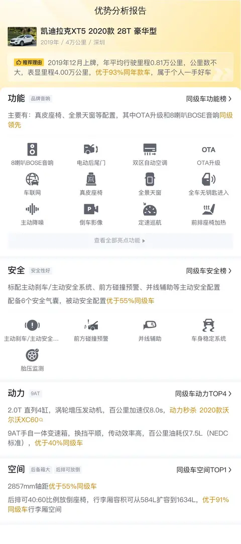 在众多的同级别车型中,凯迪拉克XT5 2020款 28T 豪华型具有以下几个明显的优势和特点:首先,车辆搭载的 2.0T 发动机具有出色的动力性能和燃油经济性,能够在保证驾驶乐趣的同时,也兼顾了日常使用的实用性和经济性;其次,车辆内部的空间宽敞舒适,座椅采用高级材质打造,提供了良好的支撑性和舒适度,让乘客在旅途中能够享受到愉悦的乘坐体验;最后,车辆配备了多种智能互联功能和娱乐系统,让驾驶者能够更加方便地掌控车辆和享受驾驶乐趣。当然,每一款车都有它的优点和缺点,只有您自己最清楚自己的需求,最适合您的车才是好车。