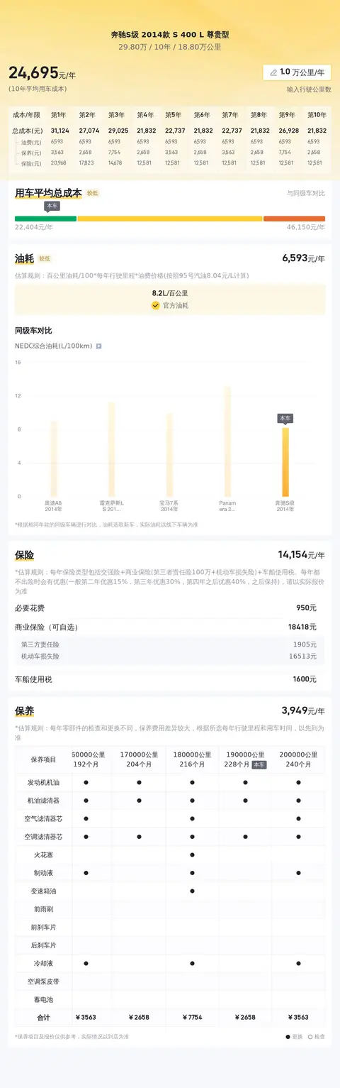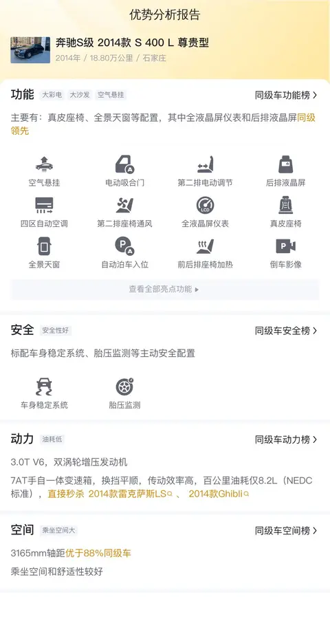 另外,根据估算,同级车的最低用车成本是18718元/年,最高是46718元/年,奔驰S级 2014款 S 400 L 尊贵型是24788元/年,用车成本适中。