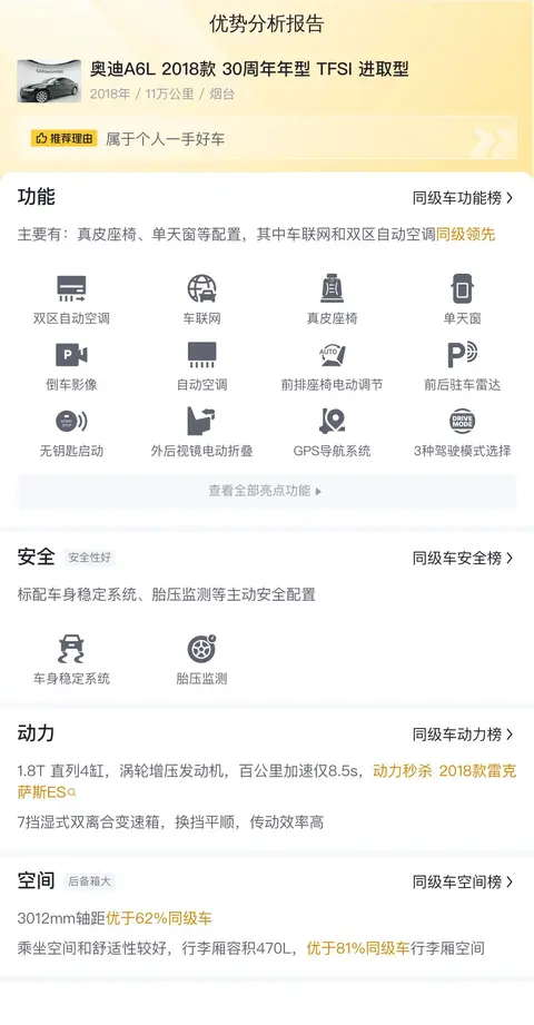 这辆奥迪A6L 2018款 30周年年型 TFSI 进取型配备真皮座椅、单天窗等配置,其中车联网和双区自动空调同级领先,同级领先:这辆奥迪A6L配备的双区自动空调允许驾驶员和乘客独立调节左右两侧的温度,营造出个性化的舒适区域,这一配置领先于多数同级车型,车联网:通过车载网络连接,实现音乐播放、导航等功能的在线更新与交互,让出行更加智能便捷,同级比较:奥迪A6L的轴距(3012mm)和行李厢容积(470L)表现均衡,但相比最宽敞的车型,其在腿部空间和行李容积上略有不足,但依然优于64%同级车型。