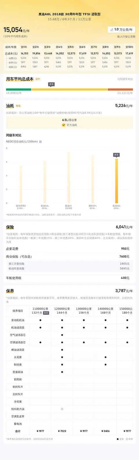 经懂车帝大数据分析,这辆奥迪A6L 2018款 30周年年型 TFSI 进取型的10年平均用车成本约15142元/年,动力方面,搭载1.8T 直列4缸,涡轮增压发动机,百公里加速仅8.5s,动力秒杀2018款雷克萨斯ES,匹配7挡湿式双离合变速箱,换挡平顺,传动效率高。