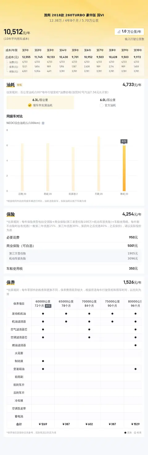 二手车市场这潭水,深不可测,车价变动大,这辆雅阁的报价在当前车况下属于比较合理的范围,至于划不划算,还得看车子的情况和您的感觉了。这车平均每年的用车成本大概11178元,保养费用一年预计5104元,保险费用参考值为4074元,当然这个跟车主的驾驶习惯和使用强度也有很大关系。