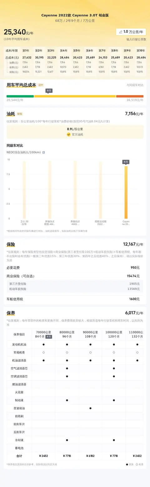 在用车成本方面,根据估算,这辆车的年均综合用车成本在2.5万元左右。需要注意的是,实际费用可能会因个人驾驶习惯及车况维护等因素有所变动。