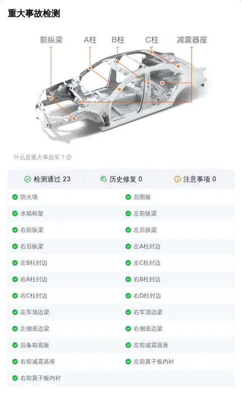 车况检测报告在购买二手车时,车况始终是买家最为关注的因素之一。为此,懂车帝对这辆大众CC 2020款 330TSI 魅颜版 国VI进行了全面的检测,并提供了详细的检测报告。在车况部分,除了外观、内饰功能的检测,更多买家关注的是这辆车是否为“三非”车辆,三非就是指非重大事故、非火烧、非水泡。因为事故车、泡水车、火烧车都存在较大的安全隐患。不过您放心,这辆车已经通过了事故检测、火烧检测和泡水检测,可以确定它非重大事故车、非火烧车、非泡水车。