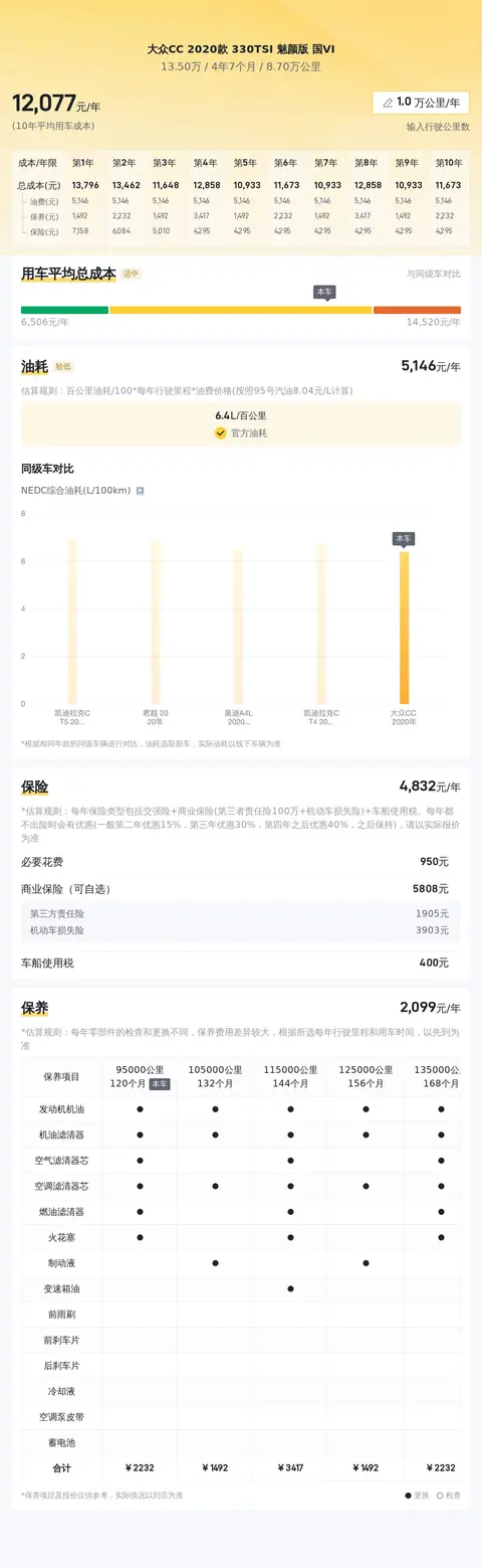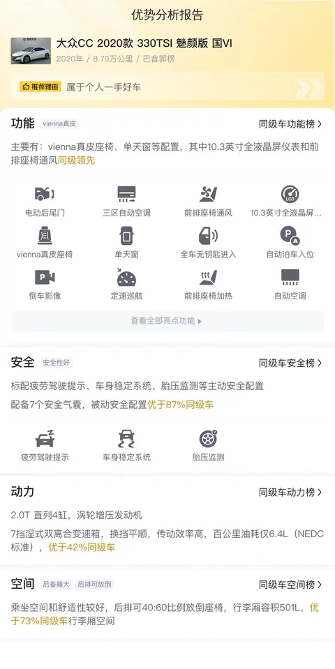 在用车成本方面,考虑到车辆的年平均综合用车成本、市场行情、功能配置以及同款比价等因素,这辆大众CC 2020款 330TSI 魅颜版 国VI车型的综合性价比指数为73%,表明其性价比较高。根据懂车帝的大数据评估,该车的热度较高,且预计未来三年内折价不大,是一款值得考虑的车型。
