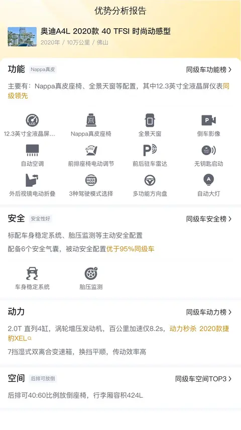 综上所述,这辆奥迪A4L 2020款 40 TFSI 时尚动感型是一款集豪华与性能于一身的中型轿车,以其强劲的动力、豪华的内饰和丰富的配置赢得了市场的认可。作为二手车,它的主要优点包括豪华品牌、较高车型级别、丰富配置、宽敞空间和良好动力性能。然而,也需要考虑里程数长、多次过户、较高用车成本等因素。总体而言,这是一款性价比不错的二手车选择,但消费者在购买前还需仔细评估个人需求、预算和维护成本等因素。