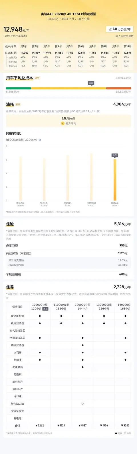 按照每年行驶一万公里计算,十年的平均用车成本大约为13455元/年,与同级别车相比处于较高区间。保险费用大约为5638元/年,保养费用约为1882元/年。燃油费用约为5936元/年,与同级别车相比处于较高区间。然而,考虑到奥迪A4L 2020款 40 TFSI 时尚动感型的高性能和豪华配置,这一用车成本仍在可接受范围内。