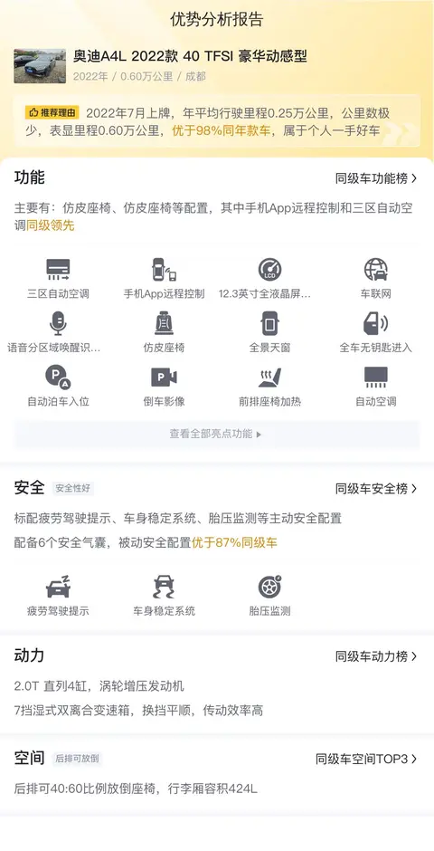 综上所述的新车含税价、用车成本、市场行情、优势分析、同款比价等数据仅供参考。在配置部分,因为二手车非标品,车辆可能会存在配置改装的情况,具体车况信息需要线下结合车辆实际情况进行综合参考。