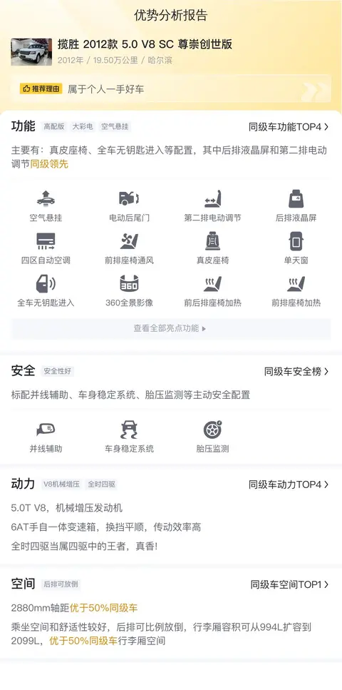 综上所述的新车含税价、用车成本、市场行情、优势分析、同款比价等数据仅供参考。在配置部分,因为二手车非标品,车辆可能会存在配置改装的情况,具体车况信息需要线下结合车辆实际情况进行综合参考。
