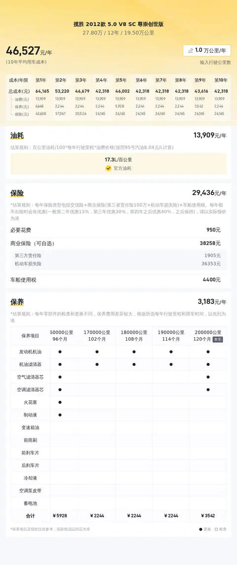 当然,购买二手车不仅要考虑购车成本,还要估算日常使用的开销。据估算,这辆揽胜 2012款 5.0 V8 SC 尊崇创世版的年均综合用车成本大约在4.7万元左右,这对于一辆豪华越野车而言,算是比较合理的支出水平。