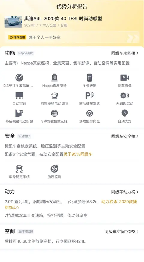 这辆奥迪A4L 2020款 40 TFSI 时尚动感型在空间、配置、舒适性等方面表现出色,是一款值得推荐的中型车。然而,由于其品牌影响力较强,因此在二手车市场上,奥迪A4L的售价相对较高。此外,这款车的维护成本也相对较高,需要车主在日常使用中投入较多的资金。