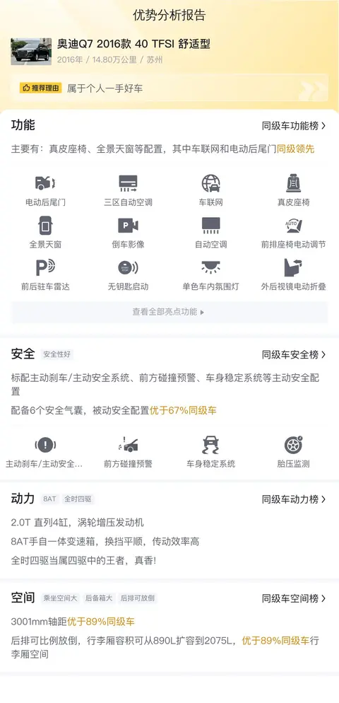 据估算,同级车的最低用车成本是17178元/年,最高是23779元/年,奥迪Q7 2016款 40 TFSI 舒适型是20555元/年,用车成本适中,不占优势。