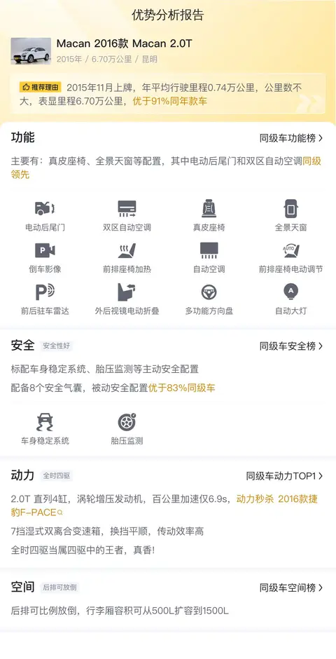 这辆Macan 2016款 Macan 2.0T,新车含税价为60.87万,如今只要18.5万,比新车便宜42.37万,而且里程数只有6.7万公里,价格很实惠。设计上,延续了保时捷的经典设计,颜值还是不错的,性能方面,2.0T发动机,以及保时捷调校的底盘,让这辆车的操控性很好,作为豪华品牌,保时捷的品质还是有口皆碑的,所以这辆车的品质也有保障。不过豪车的维修保养费用比较高,需要慎重考虑。如果喜欢,还是要尽快下手,这么实惠的价格,应该不会持续太久。