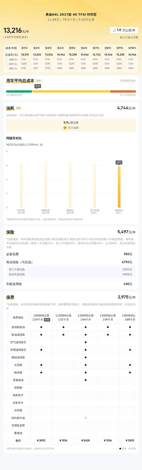 根据估算,这辆奥迪A4L 2017款 40 TFSI 时尚型的年均综合用车成本大约为1.3万元左右,实际费用支出会根据车主的使用习惯和车况维护情况有所变动。