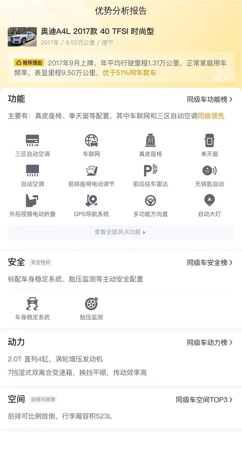 今天我们要介绍的这款奥迪A4L 2017款 40 TFSI 时尚型来自南宁,上牌日期2017年9月,表显里程9.5万公里,新车指导价33.98万,二手车报价11.98万,过户次数1次。