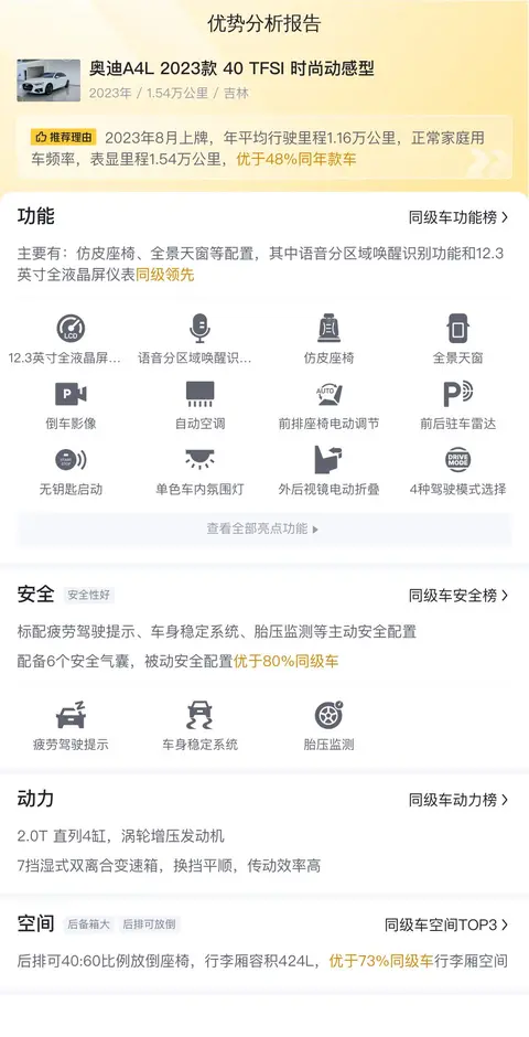 在同级别车型中,奥迪A4L 2023款 40 TFSI 时尚动感型在动力性能、内饰材质、安全配置等方面都表现出色。无论是驾驶感受还是乘坐舒适度,都能满足消费者的需求。