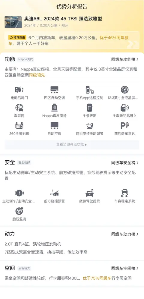 奥迪A6L作为豪华B级车市场的一款重要车型,其不仅在新车市场有着良好的表现,在二手车市场同样备受瞩目。考虑到这款2024款奥迪A6L 45 TFSI 臻选致雅型的极低里程和良好车况,它无疑是一个值得考虑的选择。如果您正在寻找一款既有豪华感又不失驾驶乐趣的二手车,那么不妨来看看这辆车吧!