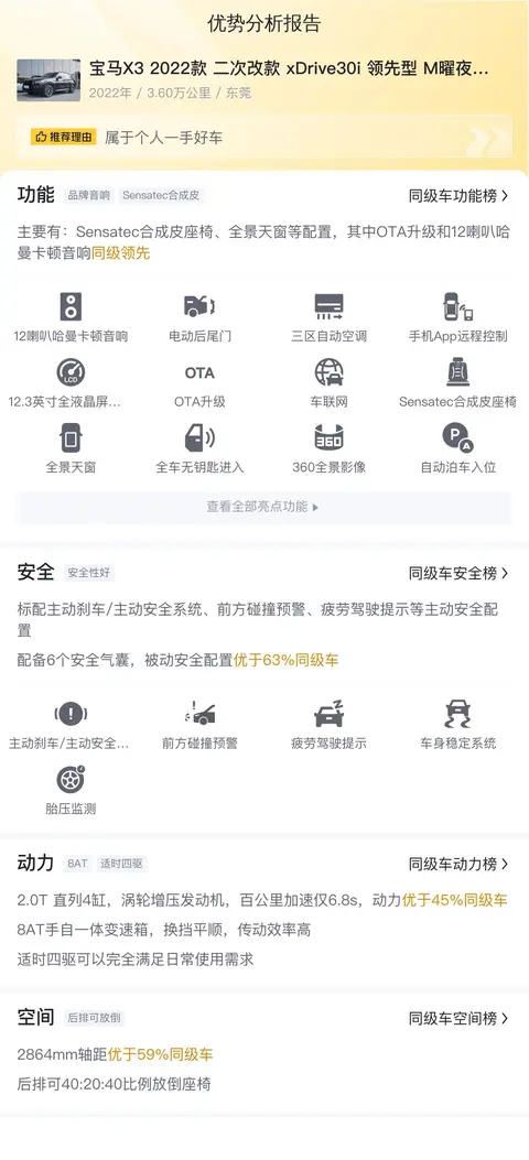 综上所述的新车含税价、用车成本、市场行情、优势分析、同款比价等数据仅供参考。在配置部分,因为二手车非标品,车辆可能会存在配置改装的情况,具体车况信息需要线下结合车辆实际情况进行综合参考。