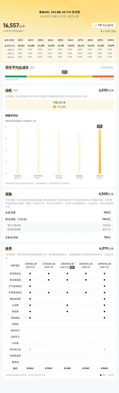 综上所述,这辆二手奥迪A6L 2014款 30 FSI 技术型在价格、配置、性能和安全方面均表现出一定的竞争力。然而,由于没有详细的检测报告,潜在买家在做出购买决定之前,应仔细检查车辆的实际状况,包括车身、发动机、底盘和内饰的磨损程度,以及是否存在任何已知的问题或需要修复的地方。此外,还应考虑车辆的维护成本、保险费用和未来的转售价值等因素。尽管二手奥迪A6L可能为用户提供了一种节省成本的购车选择,但全面了解车辆的情况对于做出明智的购买决策至关重要。