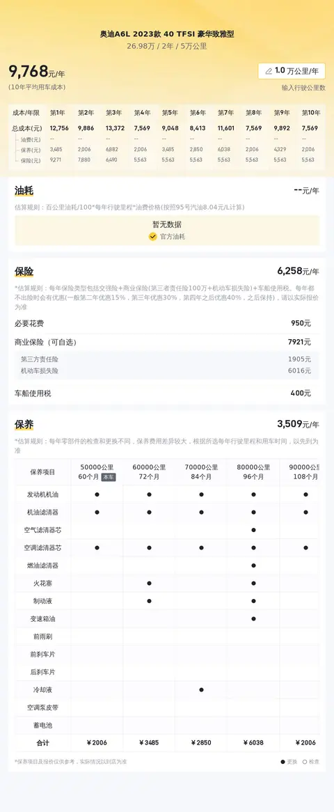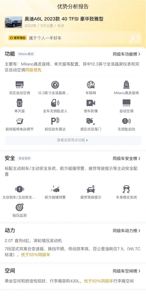 在经济性方面,奥迪A6L同样表现出色。其WLTC百公里油耗仅为7.11L,这一数据优于57%的同级别车型,使得A6L在保持豪华驾驶体验的同时,也具备了较高的燃油经济性。从使用成本来看,A6L的预计年均保险费用约为5638元,年均保养费用约为2388元,这些费用在豪华轿车中属于合理水平。此外,A6L的百公里刹车距离为378mm,这一表现优于67%的同级别车型,为驾驶者提供了更为可靠的制动性能。