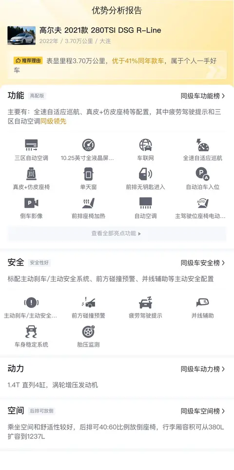 综合来看,这款高尔夫 2021款 280TSI DSG R-Line不管是外观、性能、内饰、安全都有一定的保障,虽然价格偏高,但是和新车相比,还是便宜不少,如果家用的话,这款车还是可以考虑的。