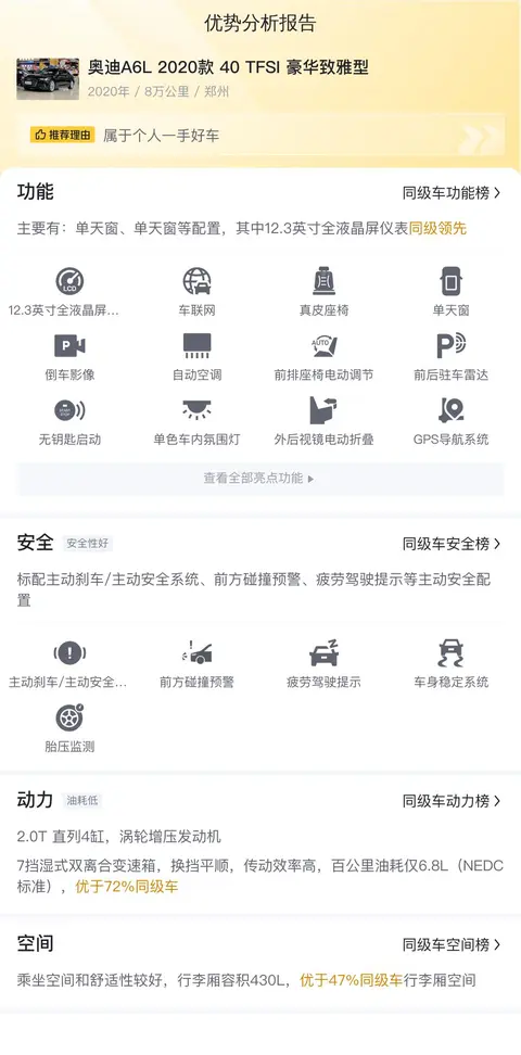 在二手车市场上,每一辆车都有其独特的故事与魅力。而这辆二手奥迪 A6L 2020款 40 TFSI豪华致雅型,无疑是一个值得考虑的选择。它不仅拥有出色的性能与配置,更有着合理的售价与较低的用车成本。如果你正在寻找一辆既能满足日常出行需求又能彰显个人品味的豪华轿车,那么这辆奥迪 A6L 绝对是一个不容错过的选择。但需要注意的是,购买二手车时务必保持理性与谨慎的态度。建议您在购买前进行全面的了解与检查,确保车辆的品质与性能符合您的期望。同时也可以借助懂车帝平台的大数据分析及专业评估团队对车辆进行深入的了解。最后祝您购车愉快,享受驾驶的乐趣。