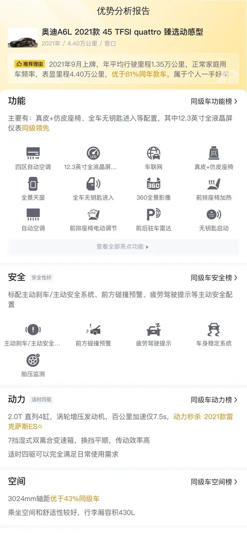 根据懂车帝平台评估数据,这辆二手奥迪A6L 45 TFSI quattro 臻选动感型是一款值得推荐的车型。它不仅拥有出色的性能和舒适的驾乘体验,而且在当前车况下,售价也比较合理。购买这样一辆二手车,您将享受到豪华轿车带来的尊贵感受,同时也能获得较高的保值率。如果您正在寻找一款性能卓越、配置丰富且价格适中的豪华轿车,那么这辆二手奥迪A6L无疑是您的理想之选。