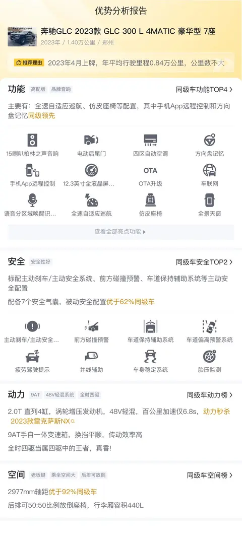 奔驰GLC 2023款 GLC 300 L 4MATIC 豪华型 7座从功能配置方面来看,主要有全速自适应巡航、仿皮座椅等配置,其中语音分区域唤醒识别功能和电动后尾门同级领先。在安全配置上,标配主动刹车/主动安全系统、前方碰撞预警、车道保持辅助系统等主动安全配置,配备7个安全气囊,被动安全配置优于57%同级车。
