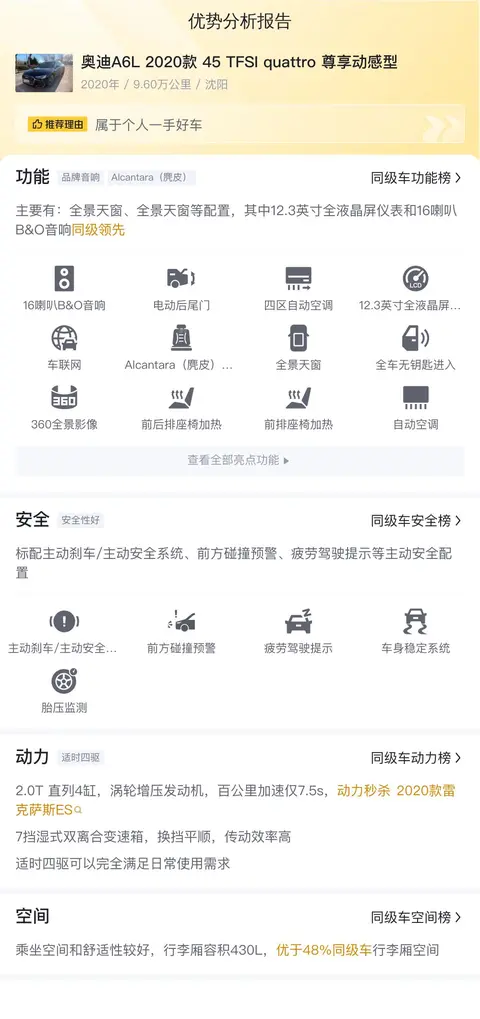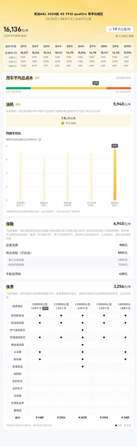 据估算,同级车的最低用车成本是7985元/年,最高是18778元/年,奥迪A6L 2020款 45 TFSI quattro 尊享动感型是16133元/年,所以用车成本较高。