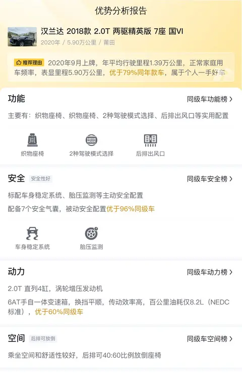 综上所述的新车含税价、用车成本、市场行情、优势分析、同款比价等数据仅供参考。在配置部分,因为二手车非标品,车辆可能会存在配置改装的情况,具体车况信息需要线下结合车辆实际情况进行综合参考。