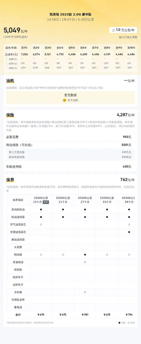 据估算,凯美瑞 2023款 2.0G 豪华版的用车成本是5906元/年,可以说比较低了。