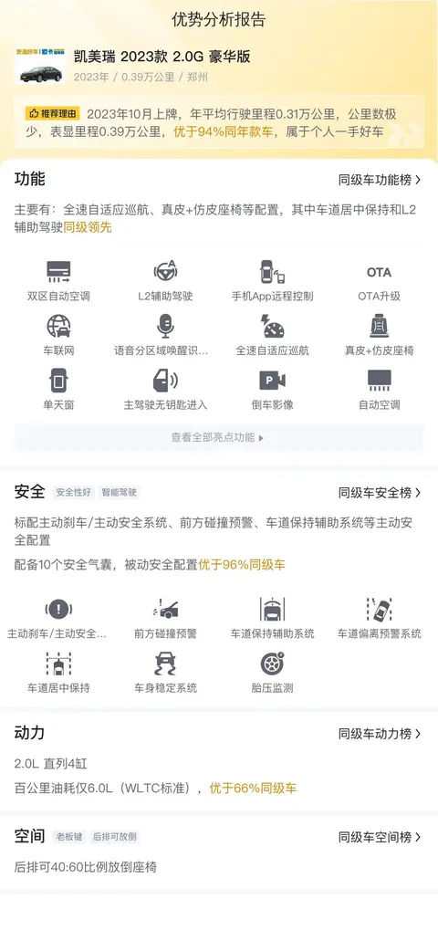 综上所述的新车含税价、用车成本、市场行情、优势分析、同款比价等数据仅供参考。在配置部分,因为二手车非标品,车辆可能会存在配置改装的情况,具体车况信息需要线下结合车辆实际情况进行综合参考。