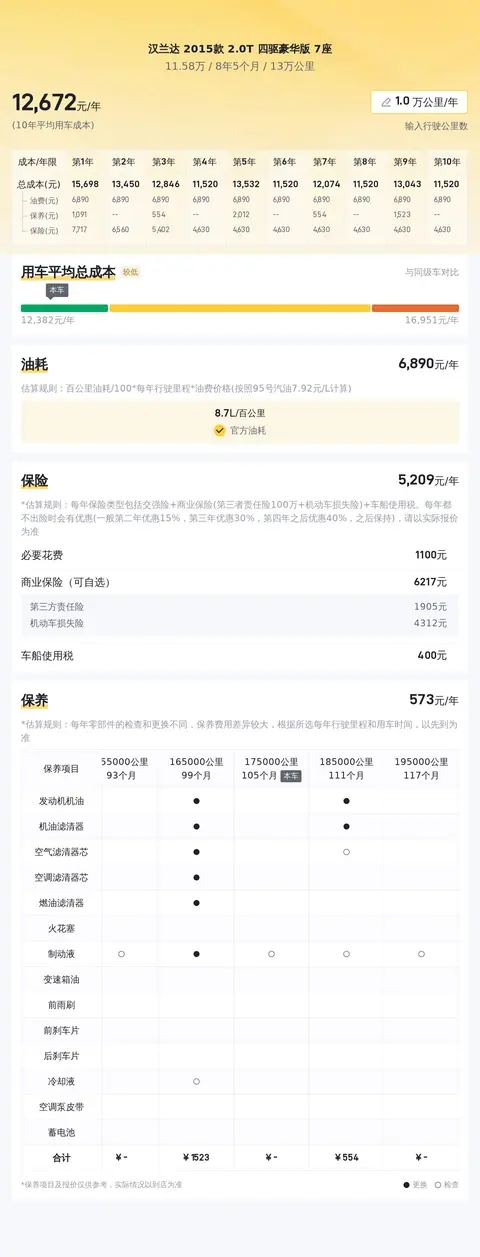 用车成本方面,在百公里油耗为8.7L的条件下,年平均油耗成本约为7168元(按8.20元/L计算)。年平均保险费用约为4380元,年平均保养费用约为1978元,十年平均用车成本约为13526元/年。
