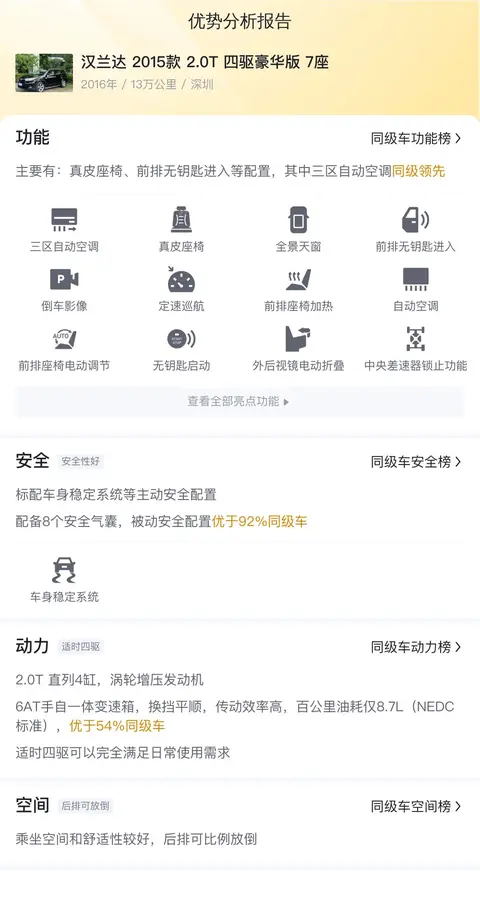 综上所述,汉兰达2015款2.0T四驱豪华版7座在动力性能、内饰配置和空间舒适性方面表现出色,是一款适合大家庭使用的中型SUV。然而,作为一款二手车,其车况、维修保养成本和油耗等问题也需要潜在买家予以关注。在购买前,建议对车辆的车况、历史记录和实际驾驶体验进行充分了解和评估,以确保购买决策的正确性和合理性。