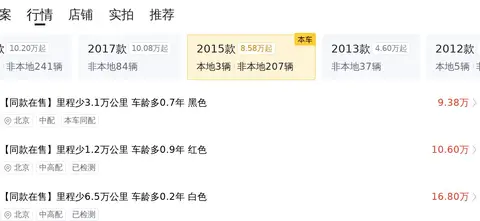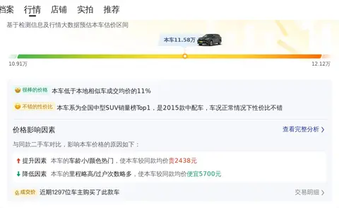 根据大数据预估显示,这辆车的二手车价格在11.6万至14.16万之间。具体的价格因车辆的车龄、里程、保养情况等因素而异,而本车的报价为11.58万,相较于新车指导价节省了17.9万,且本车是2015款的中高配车,配置丰富。