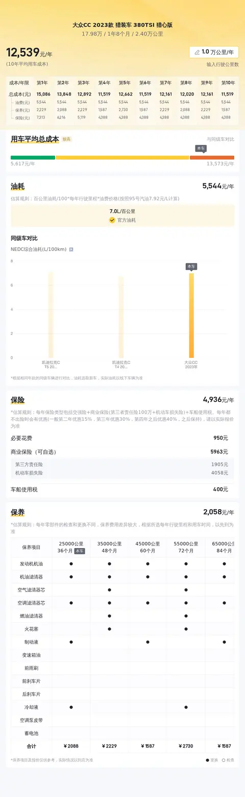 按照每年行驶1.2万公里计算,10年平均用车成本约13507元/年,因为同级车最低用车成本是10803元/年,最高是14931元/年,所以这个费用不算低。