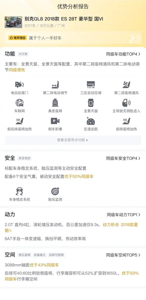 综上所述,别克GL8 2018款 ES 28T 豪华型 国VI是一款集豪华、舒适、实用于一体的MPV车型。它在内饰配置、动力性能、乘坐空间等方面都有着出色的表现,是一款适合家庭出行和商务接待的高品质车型。然而,作为一款二手车,它也存在一些缺点,如里程数高、油耗较高等。对于消费者来说,在购买时需要根据自身需求和预算进行综合考虑。总体而言,如果您正在寻找一款豪华舒适的MPV作为家庭出行或商务接待之选,那么别克GL8 2018款 ES 28T 豪华型 国VI无疑是一个值得考虑的选择。