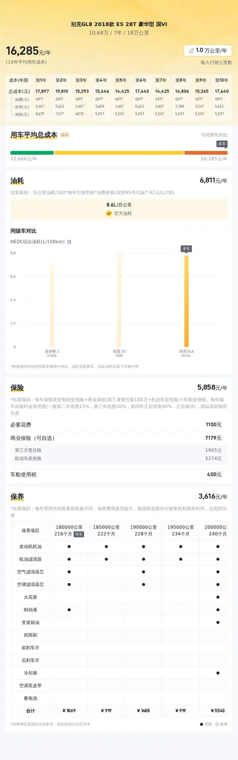 根据懂车帝官方的大数据分析,别克GL8 2018款 ES 28T 豪华型 国VI的10年平均用车成本约为16153元/年,与同级别车型相比处于中等偏上水平。这一成本包括油费、保养费、保险费等各项支出。相较于一些经济型车型,别克GL8的用车成本确实较高;但对于追求舒适性和品质感的消费者来说,这一成本仍在可接受范围内。