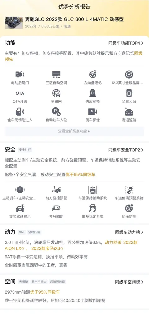 今天介绍的这款奔驰GLC 2022款 GLC 300 L 4MATIC 动感型,上牌日期2022年2月,表显里程6.03万公里,黑色车身深色内饰,新车指导价44.73万,二手车报价29.2万,过户次数1次。车源地和上牌地都是南通。